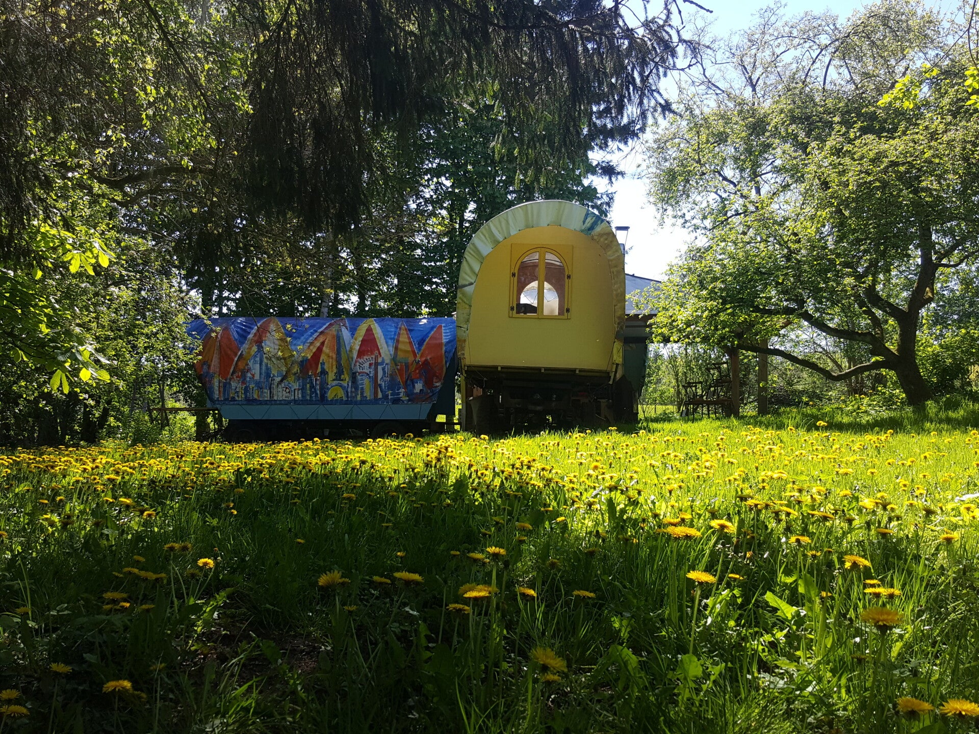 Haben Sie gebucht, weil die Bilder so bunt aussahen? Gut. Die Farben sind so expressionistisch, dass sie schon fast wieder aggressiv sind. Wir haben DREI dieser Fahrenden Bruchbuden um unser Zentrum des minimalistischen Überlebens gruppiert: