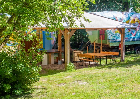 Wir sind ehrlich: Wenn Sie hier "Glamping" erwarten, sind Sie getappt. Das hier ist die letzte Bastion des Expressionismus auf ausgemusterten Traktoranhängern.