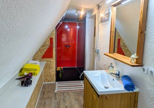 - eine steile, schmale Treppe führt in das Dachgeschoss